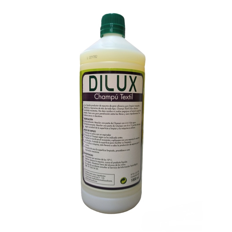 Dilux Champú Textil 1Lt. es un liquido productor de espuma que proporciona grandes resultados para limpiar moquetas, alfombras y tapicerías de tela de todo tipo.