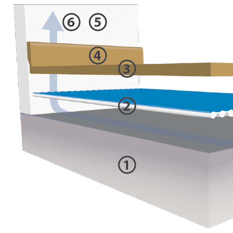 Debido a la diferencia de temperatura y presión entre la habitación y bajo la tarima, el aire húmedo pasa por los canales y es sustituido por aire fresco.