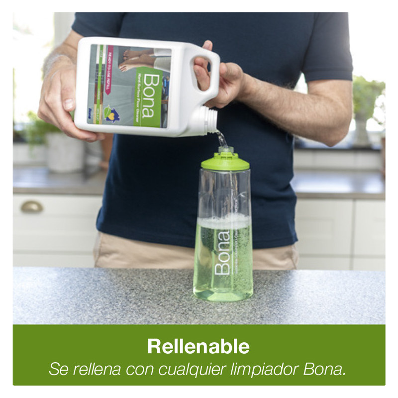 Botella de Limpiador de Suelos laminados y Superficies Duras Bona se utiliza con la Spray Mop Premium para Suelos laminados y superficies duras Bona. Su fórmula sin aclarado no deja residuos y limpia eficazmente las superficies duras eliminando el polvo, la tierra y la suciedad.