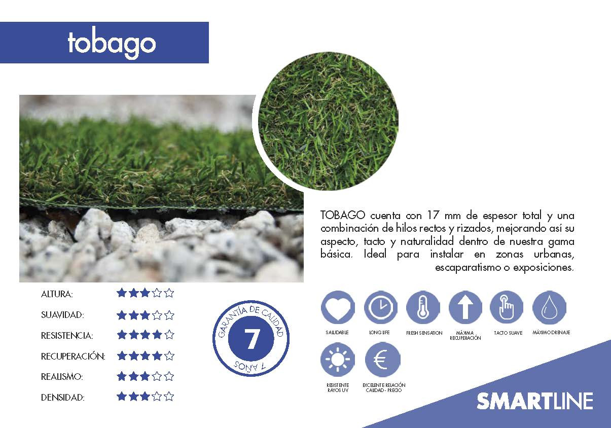 El cesped TOBAGO cuenta con 17 mm de espesor total y una combinación de hilos rectos y rizados, mejorando así su aspecto, tacto y naturalidad dentro de nuestra gama.