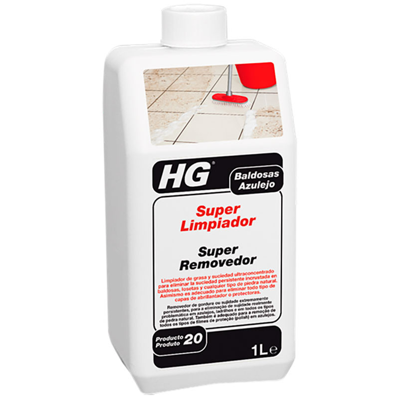 HG Super Limpiador (HG producto 20) es un limpiador profesional, ultraconcentrado, para eliminar la suciedad persistente incrustada y las (antiguas) capas difíciles de eliminar de cera, abrillantador y capas protectoras y capas protectoras en baldosas, losetas y cualquier tipo de piedra natural.